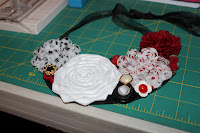 Here is the latest bib necklace. This one is done on black canvas and it is red, white & black with a hint of gold. I have enough bibs to make five more. I got the center set on the pink cuff bracelet. Tomorrow I plan to set rhinestones and add a few other things. Hopefully it will be ready for a 'tomorrow' post.
